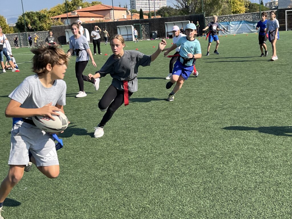 Résultat : une très haute intensité d’engagement, que l’on voit rarement dans les autres sports. Heureusement qu’il s’agissait de flag rugby, autrement dit de rugby sans contact ! De 9h45 à 15h15, on a vu des minots littéralement mordre dans le ballon, avides de marquer, s’offrant des chevauchées fantastiques ou bâtissant des phases de jeu parfois très habiles.